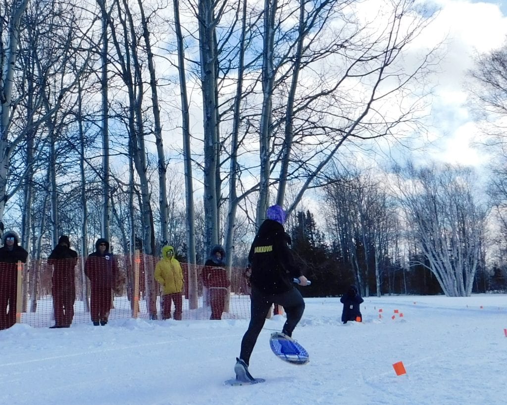 “Practicing was really hard on the lungs, like trying to chisel a hole [in the ice], and you gotta be fully dressed in extra layers,” Wolfrey, who competes the Labrathon, snowshoe biathlon and target shooting, says. But the following week might be too warm.