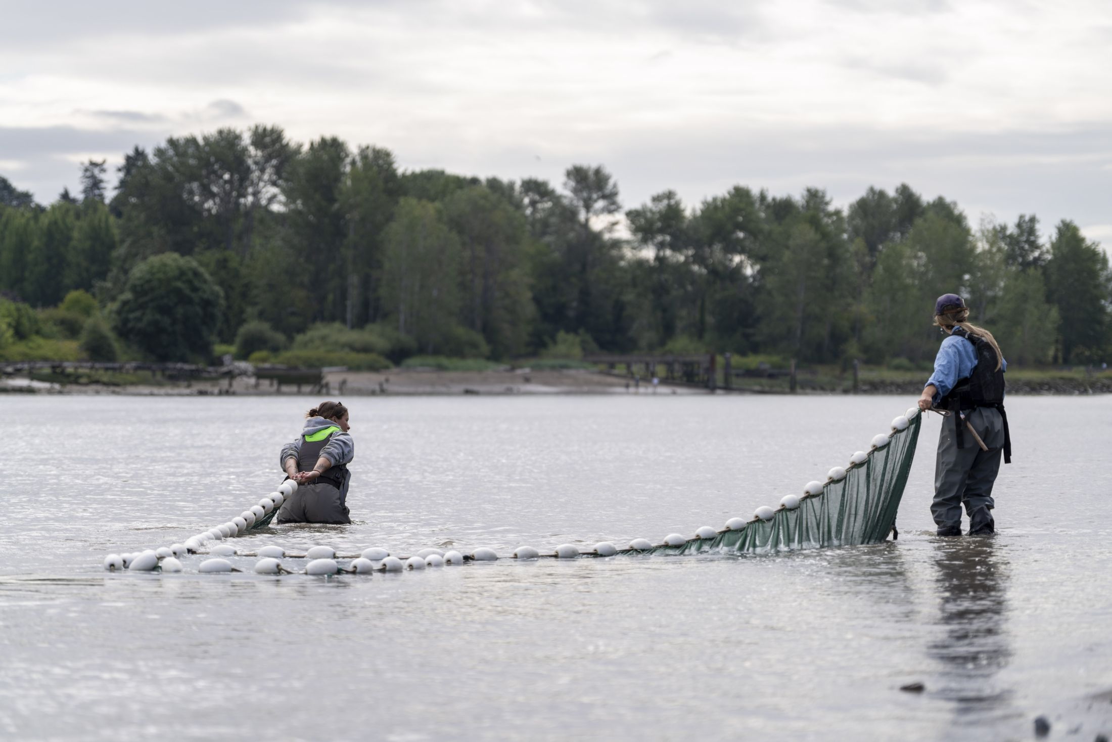 Two salmon conservation technicians slowly drag a wide net through the north arm of the Fraser River, past the entrance to a marsh that until recently was so densely packed with invasive cattails, even small juvenile salmon may have struggled to navigate it.