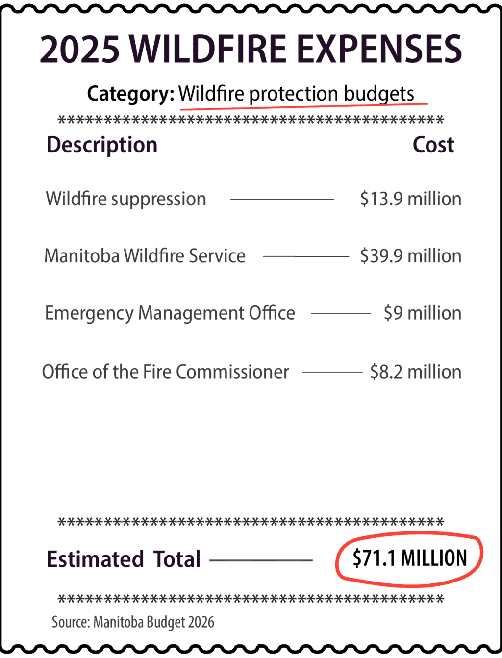 In the fiscal year including those wildfires, Manitoba spent $383 million on government emergency expenditures. Nearly all of that, $375 million, was attributed to wildfires, seven times more than what was budgeted.