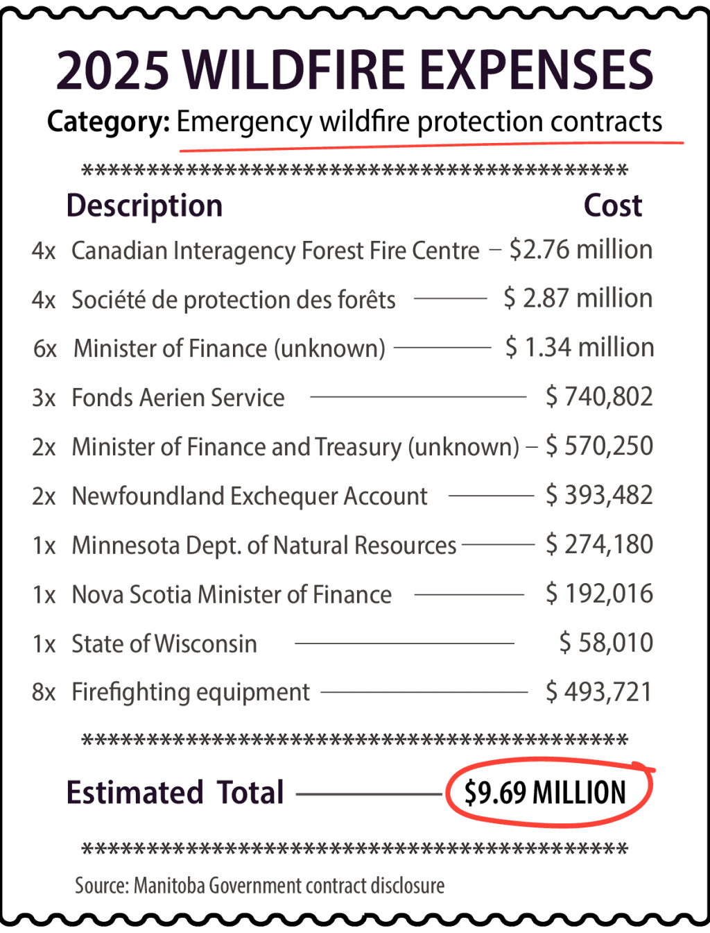 The Société de protection des forêts contre le feu, a non-profit fire protection agency based in Quebec, received about 40 per cent of those funds. The agency sent more than 150 firefighters from Quebec and France, as well as logistics support, through June and July. While Manitoba’s records show contracts totalling $2.8 million, the agency’s annual report indicates it billed Manitoba for more than $5.1 million in 2025. This suggests some out-of-province payments are not yet recorded in Manitoba’s contract records.