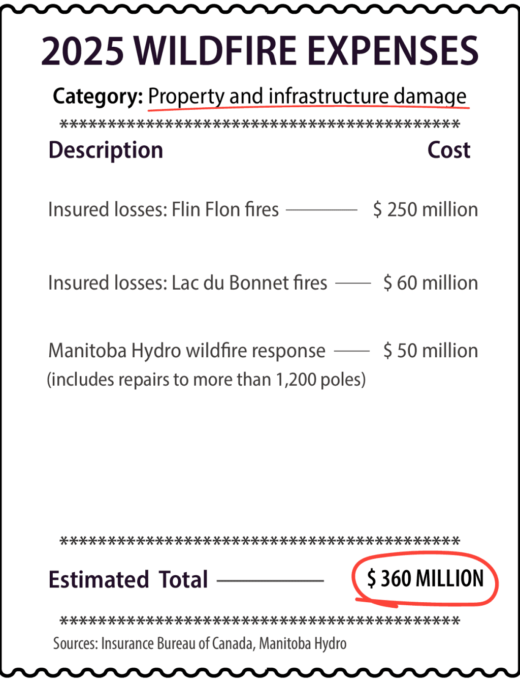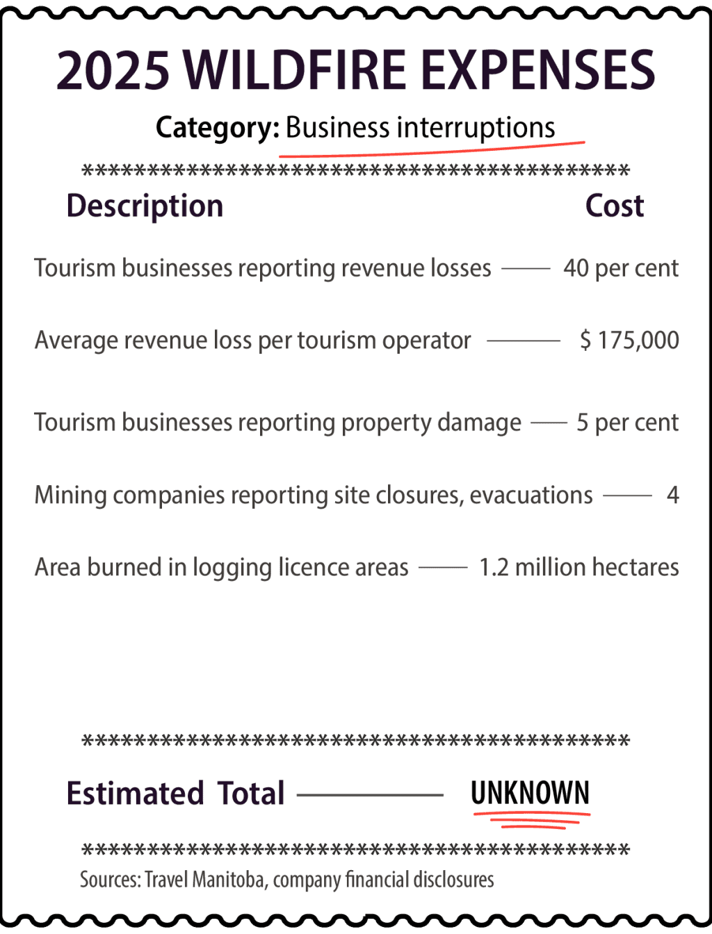 The costs compiled here represent only a portion of the long-term economic impacts wildfires will have on Manitoba’s economy. It will take several months for government agencies and private companies to finish taking stock of the damage; some losses will never show up in financial records or industry reports.