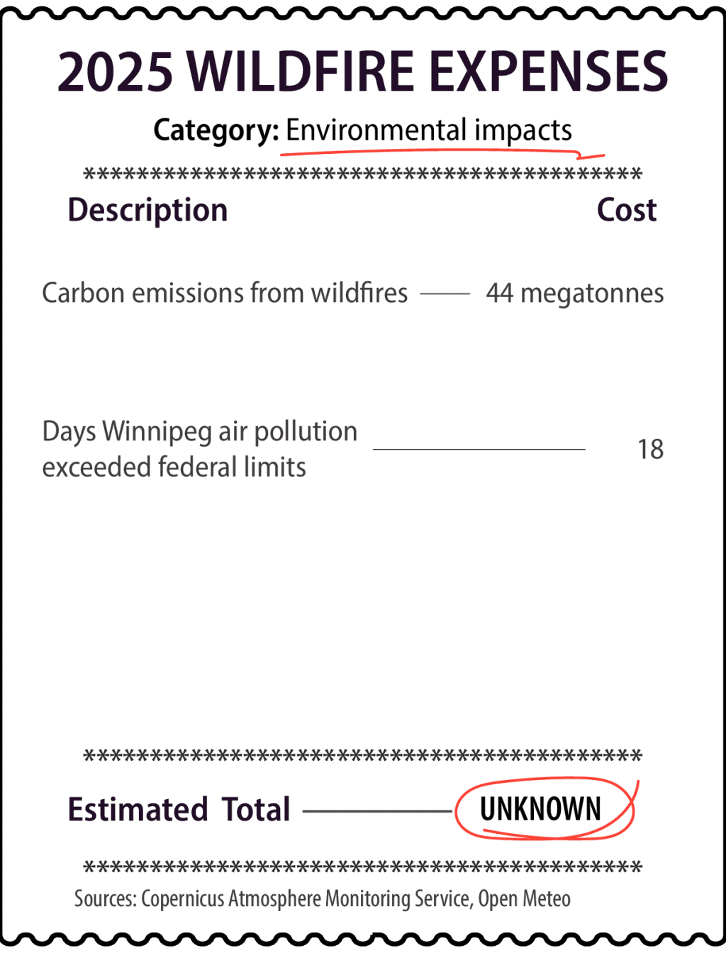 An analysis by The Narwhal and the Winnipeg Free Press found at least $500 million in expenses directly attributable to the wildfires — costs tied to emergency response, evacuations, damaged infrastructure, shuttered businesses, lost homes and much more. The true cost will never be known, as the impacts are far-reaching and far less tangible, and likely far, far higher.