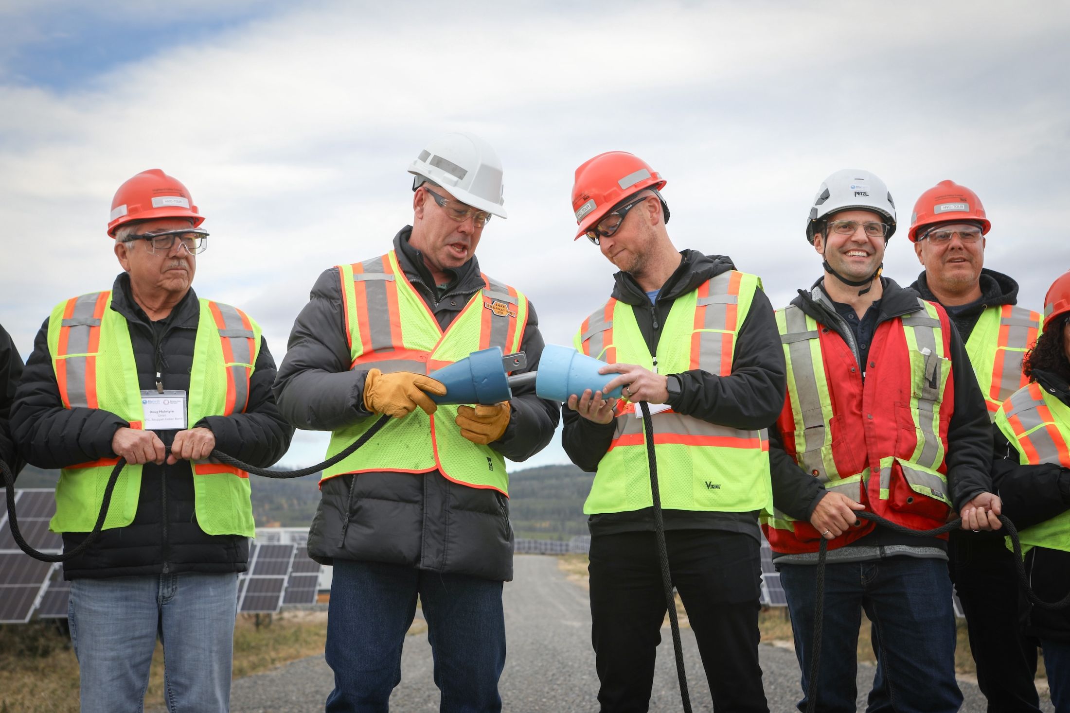 For the occasion, Oregon Jack Creek Band Chief Matt Pasco holds one end of a giant, make-believe power outlet with a cotton rope for a wire, a lighthearted decoy to celebrate B.C.’s first grid-scale solar project at an event on Oct. 16. But the real thing is already hooked up and buzzing in the background.