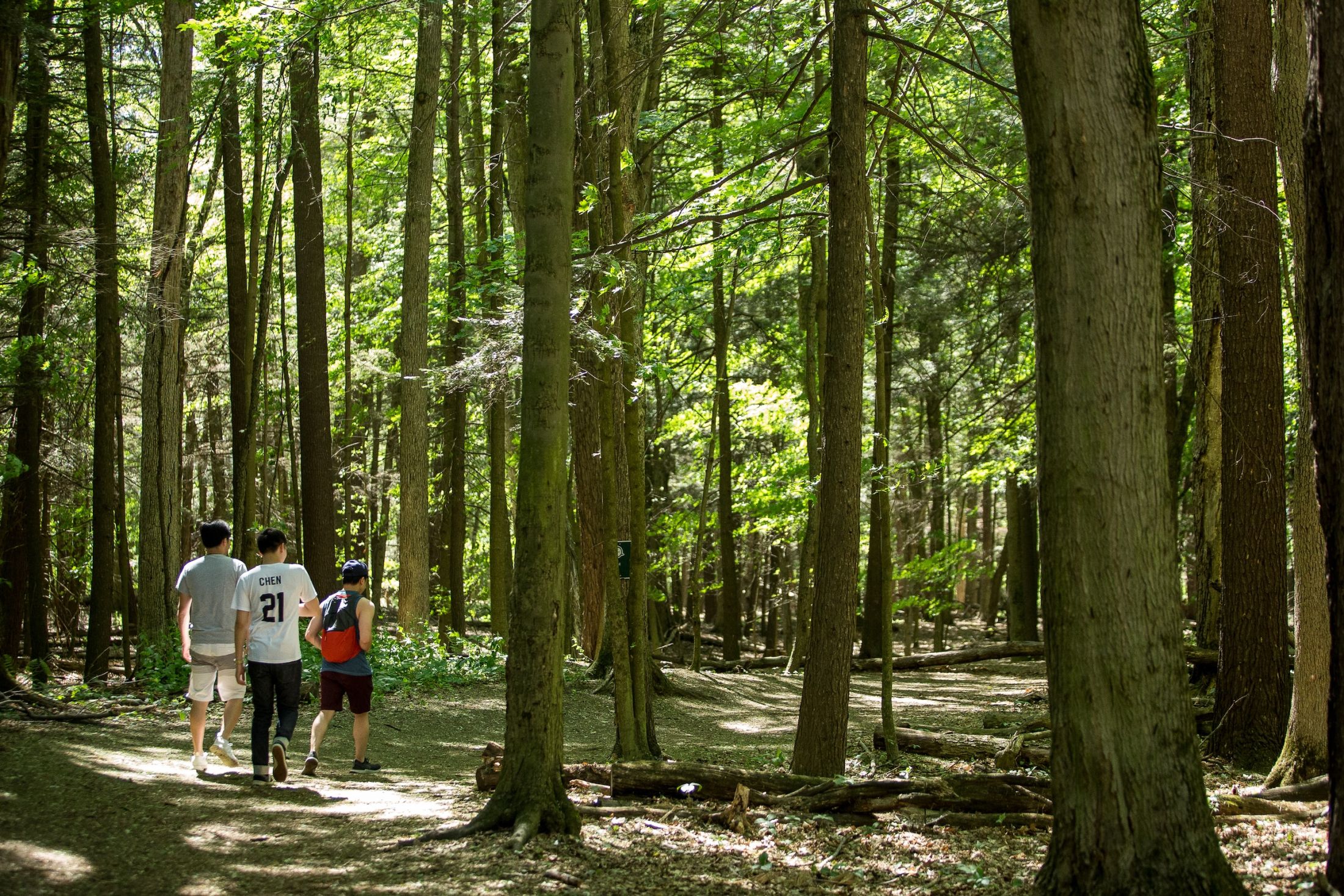 A forested path shown in dappled daylight.